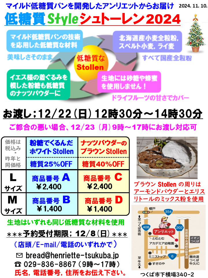 早や1年間が過ぎもうクリスマスシーズンに入ろうとしています。ついこの間の暑さは何だったのでしょう。秋の紅葉を楽しむこともできず、木枯らしが吹き始めました。この1年間で大きく変わったことは「物価の高騰」ではないでしょうか? パンの材料として価格上昇が厳しいのは、小麦粉よりもチョコレートとオリーブオイル,ドライフルーツ類です。シュトーレンにもこれらの材料を使用しますが、アンリエットでは今年のシュトーレンも,昨年と同じ材料種類,大きさ,美味しさをそのままにして同一価格で販売します。